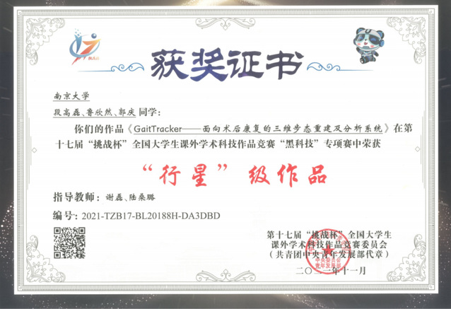 GaitTracker步态分析系统经过我系谢磊教授、陆桑璐教授的悉心指导,由计算机系学子独立设计完成,并不断进行系统的迭代优化,此前凭借创新型的平台已斩获多项系统类的荣誉:在2021年第十七届“挑战杯”全国老员工课外学术科技作品竞赛过程中,取得黑科技专项赛国赛“行星”级作品、江苏省赛特等奖;2021年中国高校计算机大赛-网络技术挑战赛华东赛区一等奖。