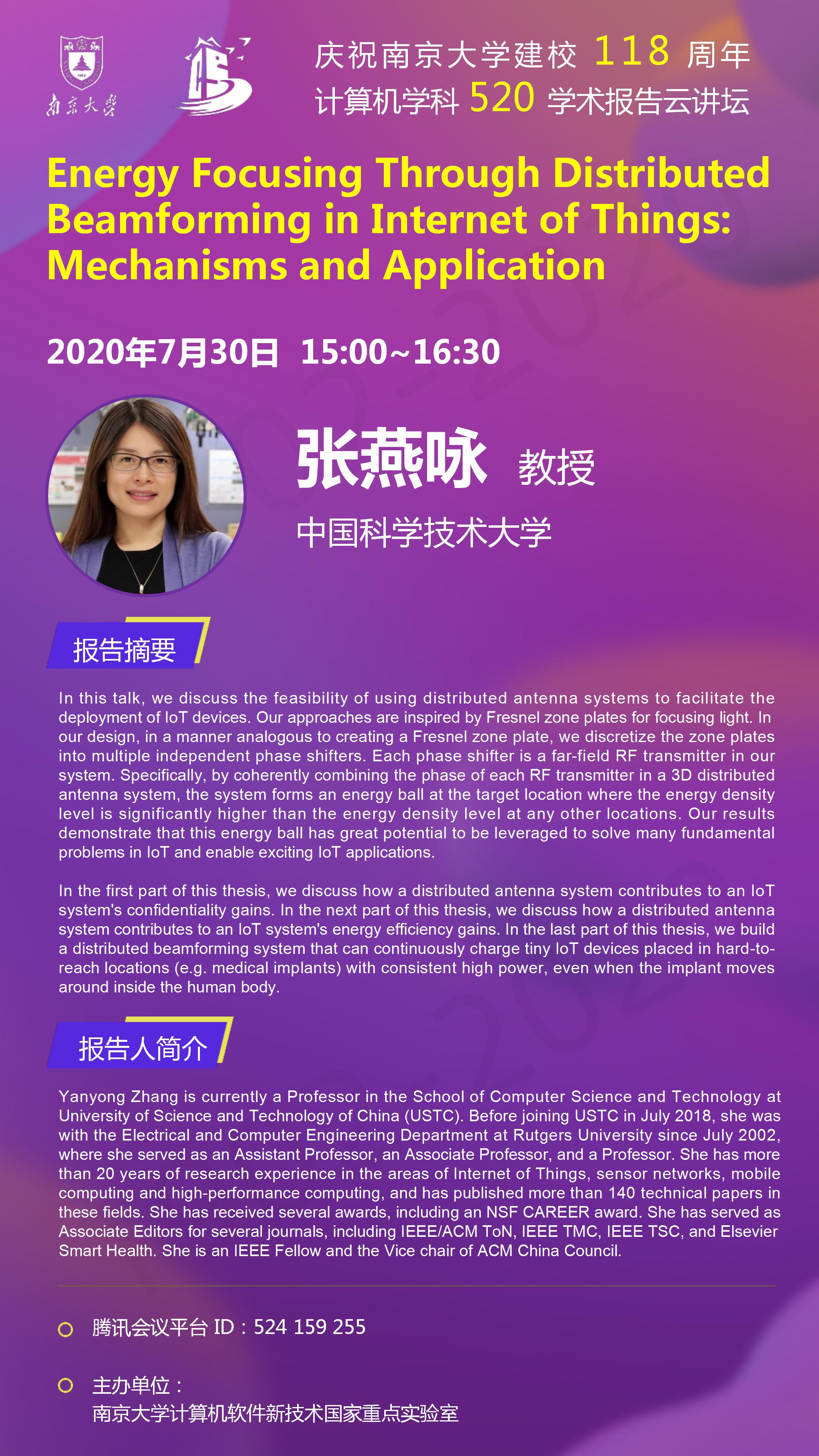 庆祝伟德国际bevictor官方网站建校118周年 计算机学科520学术报告云讲坛- 张燕咏 教授