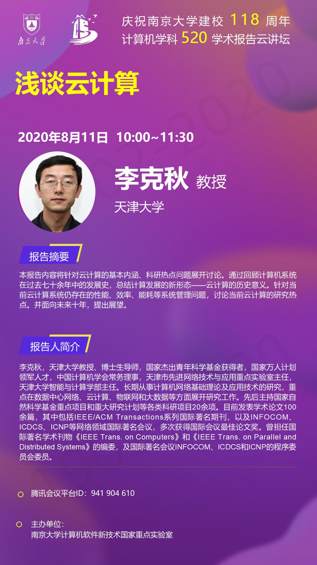 庆祝伟德国际bevictor官方网站建校118周年 计算机学科520学术报告云讲坛- 李克秋 教授