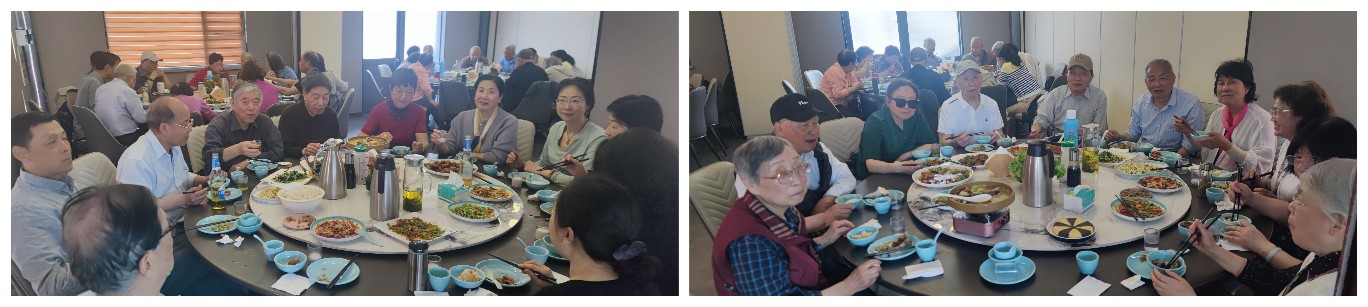 中午,旅行社特别安排在茅山脚下农家乐用餐,茅山老蛾、农家土鸡汤、乡村老豆腐、时令野菜和特色乌米饭等地道菜肴让老同志们赞不绝口。席间,党支部书记兼院退协分会负责人潘金贵结合中央乡村振兴和美丽乡村建设政策精神,现场分享仙姑村从贫困村到全国文明村的蜕变历程。