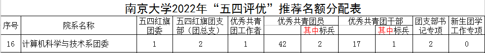 4、优秀共青团员及标兵(共42个推荐名额,含标兵2个):名额分配如下:(1)本科18级6人(每支部1人),19级5人(每支部1人),20级11人(1-4班每支部2人,5-7班每支部1人),共计22人;(2)研究生(含硕士、博士)各支部共计7人;(3)员工会5人;【注意:团委员工会产生候选人之后请及时告知候选人所在总支、支部以免重复推荐】(4)研究生会5人。【注意:研究生会产生候选人之后请及时告知候选人所在总支、支部以免重复推荐】(5)系青协3人【注意:系青协产生候选人之后请及时告知候选人所在总支、支部以免重复推荐】。(若支部、团学组织无合适人选,则名额收回统一分配。)