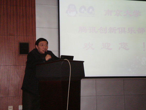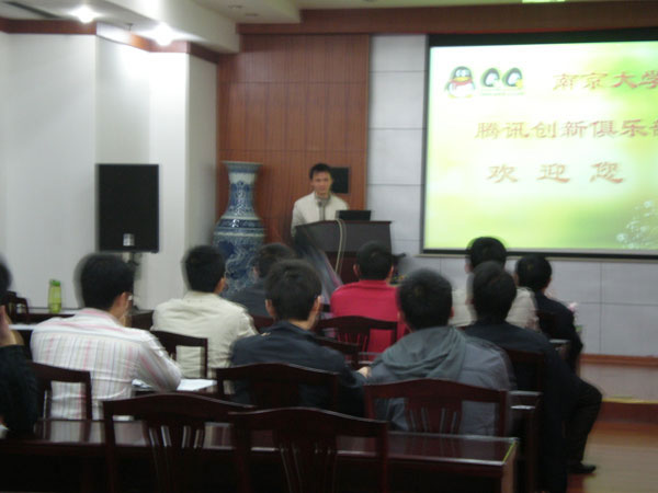 随后,主持人彭树深讲话,他先阐明了俱乐部性质:本俱乐部是以互联网产品创新为核心的社会实践的高校员工社团,是包括工商管理、市场、产品、研发、项目、运营等多专业的协作团队。俱乐部隶属于伟德国际bevictor官方网站计算机系,由腾讯科技有限公司提供资金支持,现任指导老师为王林章教授;俱乐部宗旨:勇于创新,共同成长!俱乐部主要开展与计算机互联网技术有关的活动。俱乐部下设的4个部门——即主席团,秘书部,策划部,技术部。