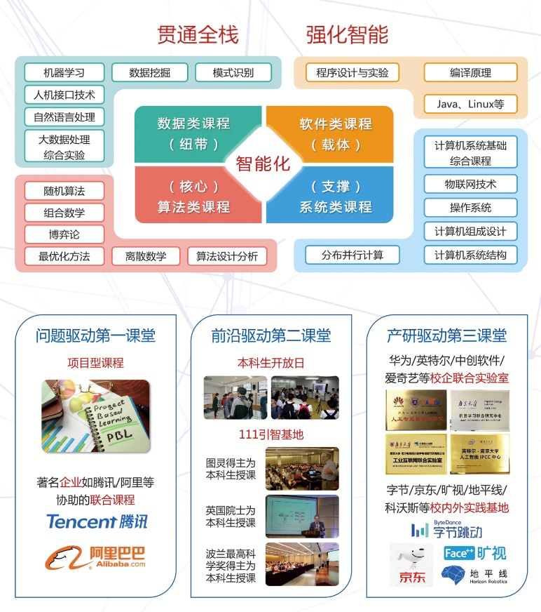 The Department of Computer Science and Technology of Nanjing University has fully leveraged its disciplinary advantages in software and intelligence. By taking “data, algorithm, software, and system” as the starting point, they have maintained the total number of credits and hours while focusing on key areas, making up for deficiencies, shifting focus, and strengthening teacher resources. They have focused on internal improvement and explored a path with Nanjing University’s characteristics. First, they have strengthened the theoretical foundation of computer intelligence by taking data as the link and algorithm as the core. Second, they have established a professional knowledge structure for human-machine-object fusion by taking software as the carrier and system as the support. Third, they take “triple integration and application-oriented” as their guiding principle, and strengthen students’ ability to abstract and solve applied problems through the following three courses: