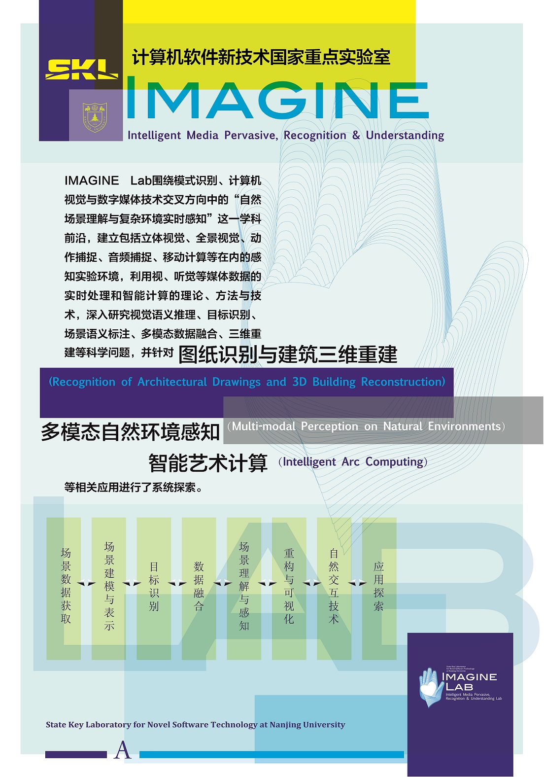 IMAGINE (Intelligent Media pervAsive, recoGnItion & uNdErstanding) is a lab established at National Key Lab for Novel Software and Technology at Nanjing University, China. The targets of IMAGINE lab include both algorithm/theory exploration and real-life systems developing. We believe automatic understanding and visualizing the content of everyday real (big) media data stream is one of the fundamental challenges in computer science, and significant advances will be made over the next few years by combining the state of the art knowledge representations and machine learning or statistical modeling techniques on big multimeida data from Internet.